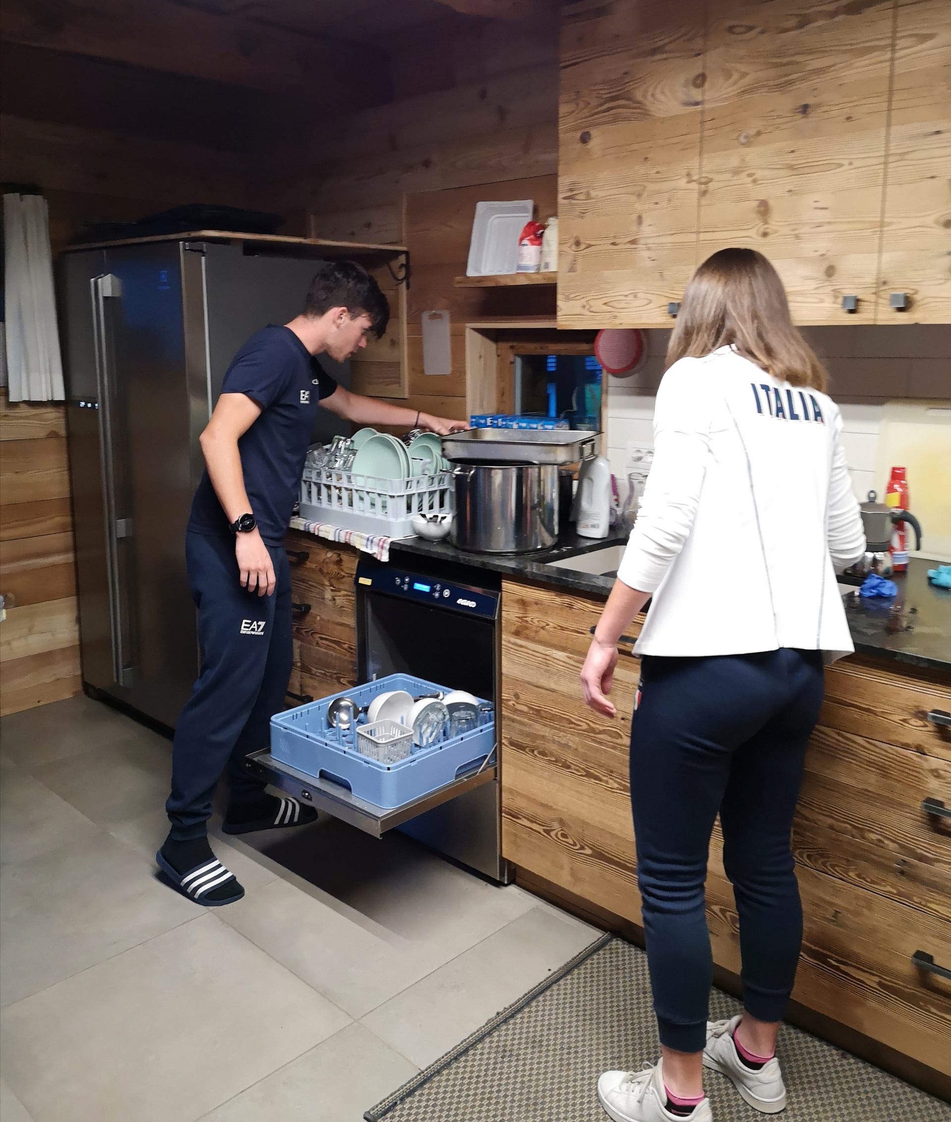 By noon, the big group of 16 athletes and 8 coaches were back at their rustic apartments, down the Antholz Valley. “We got back around 12 to have lunch. One of the other coaches Daniele Piller Roner is our cook; each day two athletes help to clean the kitchen. We have a big apartment with a big garden which is very nice, to have a lot of space. The athletes can stretch and relax out there and with the coronavirus, not be so close together.”