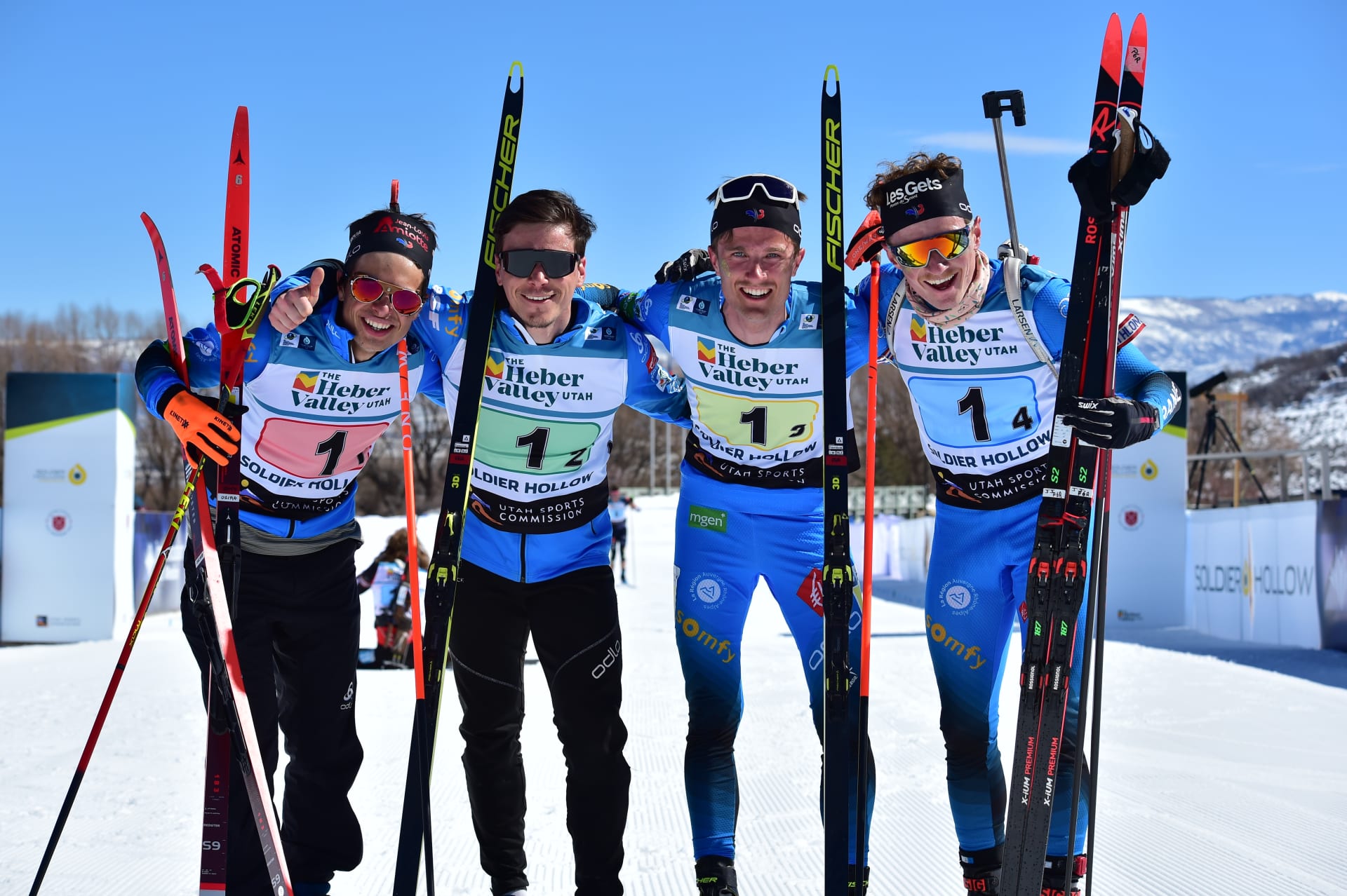 The final day of the 2022 IBU Youth and Junior World Championships at the Soldier Hollow 2002 Olympic Games Venue was just as spectacular as many of the days this past week in Utah. It froze just hard enough overnight to set the tracks, but by the time the fifteen Junior men’s relay teams started at 11 am local time, the temperature was up to +8C and rising under once again brilliant blue skies and the wind flags completely flat. Despite the perfect conditions, only the USA’s Bonacci went 5-for-5 in the first prone stage. Still, Italy’s Leonesio got away in the top spot with a single spare round, along with Czech Republic with nine other teams all within 16 seconds. By the time they reached the standing stage, eight teams were closely bunched, with Overby after a second spare round in front, followed by Canada, Italy and USA withing 10 seconds.