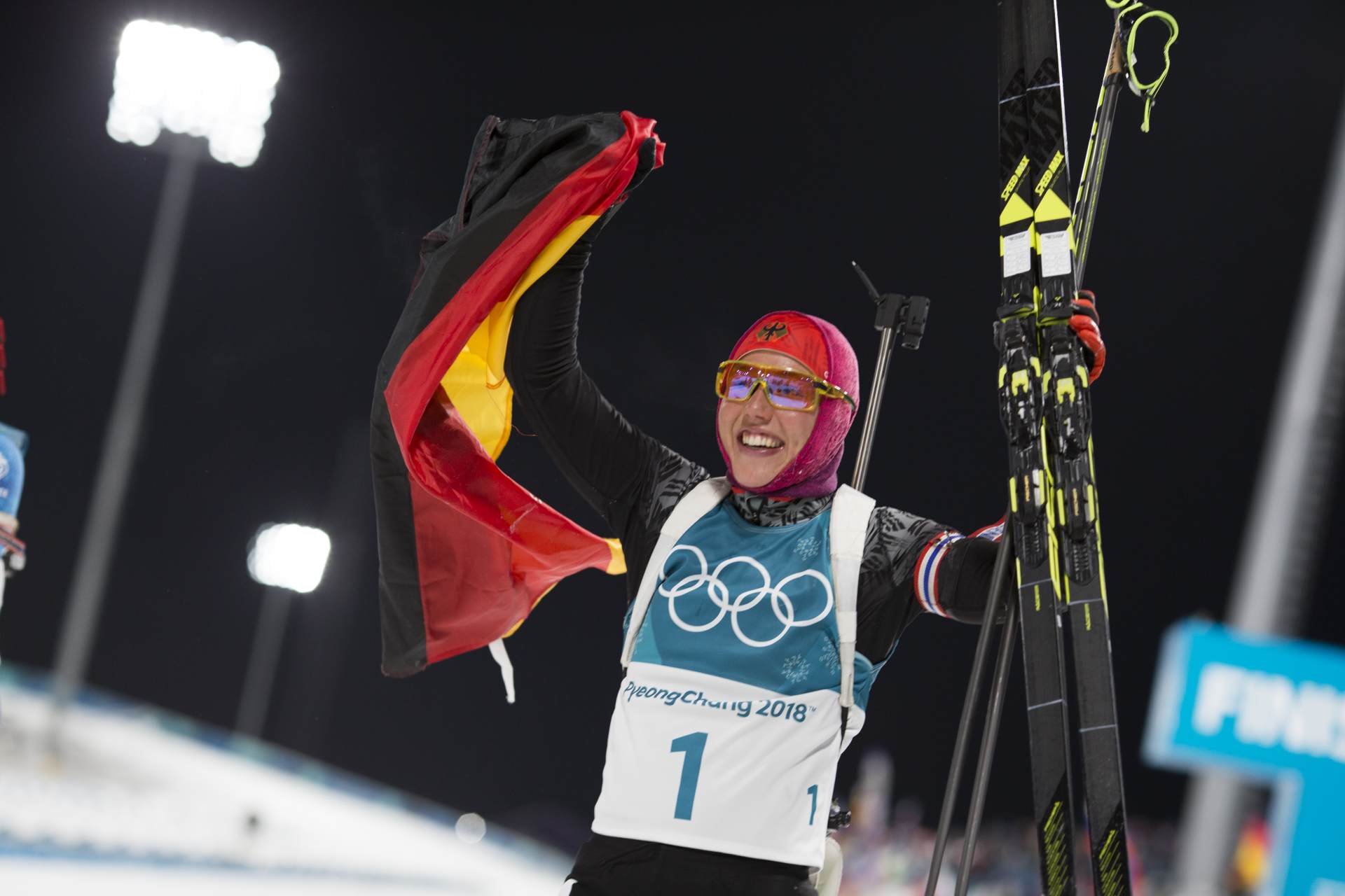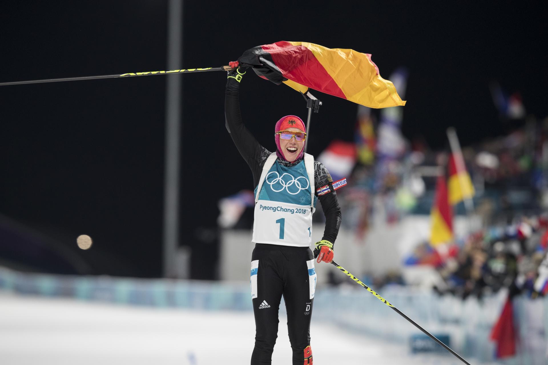Germany’s Laura Dahlmeier became a double Olympic Gold medalist with her one-penalty pursuit victory tonight, crossing the finish line in 30:35.3, waving a German flag ad smiling broadly. Anastasiya Kuzmina of Slovakia needed a finish straight sprint to claim the Silver medal by .2 seconds over France’s Anais Bescond. Kuzmina, with four penalties finished 29.4 seconds back while the one-penalty Bescond was 29.6 seconds behind Dahlmeier.