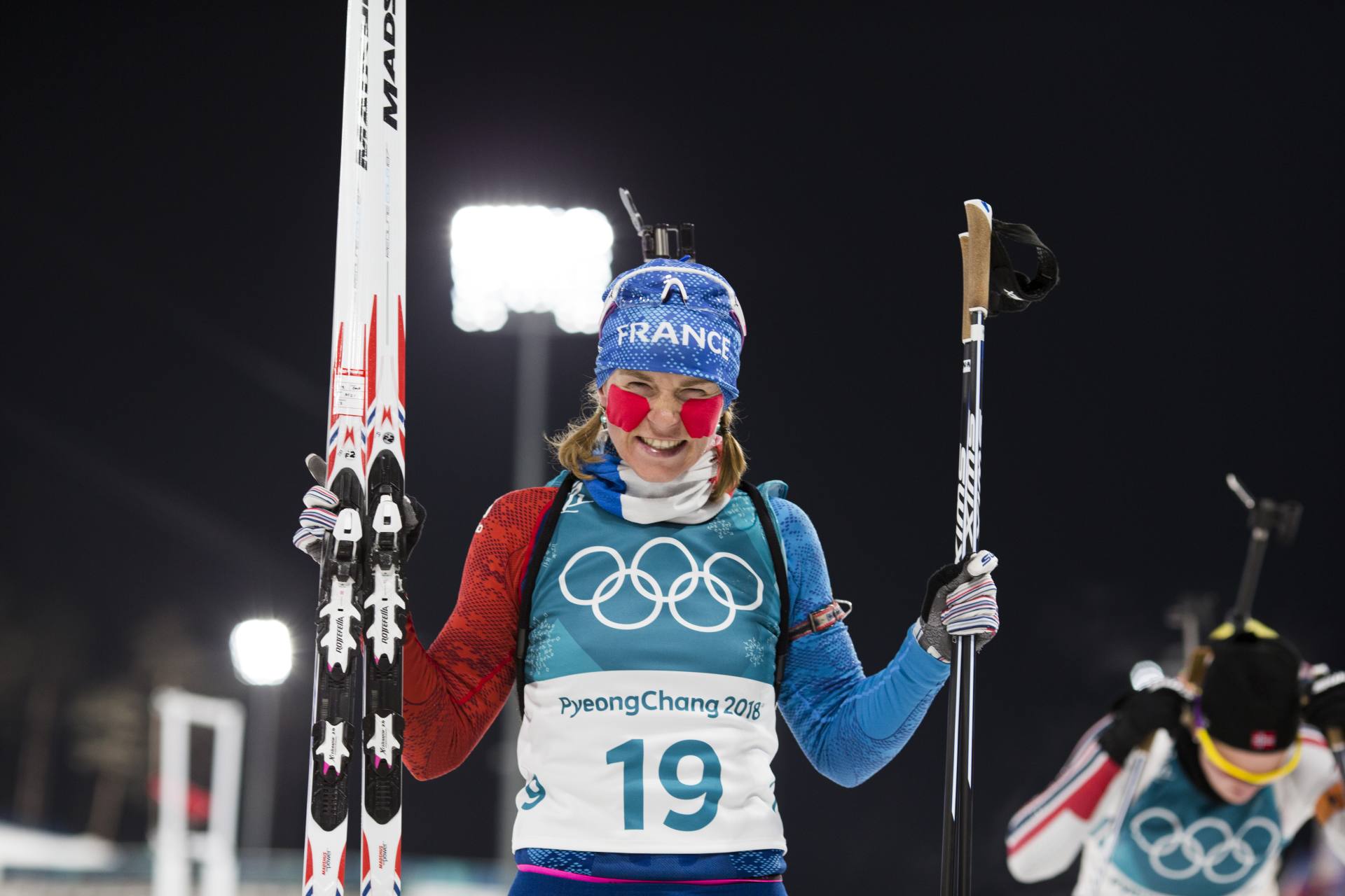 Five Shots Seal Gold Medal Number TwoThe German star closed the final five targets with ease headed towards her second Gold medal. Kuzmina comfortably in second missed her first shot but dropped the next four and headed to the penalty loop. Bescond responded with a fast clean stage to leave in the Bronze spot, .8 seconds behind Kuzmina. These two battled over the next 2K, with Kuzmina staying just a step ahead and the French veteran battling to stay with her. Dahlmeier skied into the stadium comfortably, grabbed German flag and crossed the finish line with a huge smile on her face.