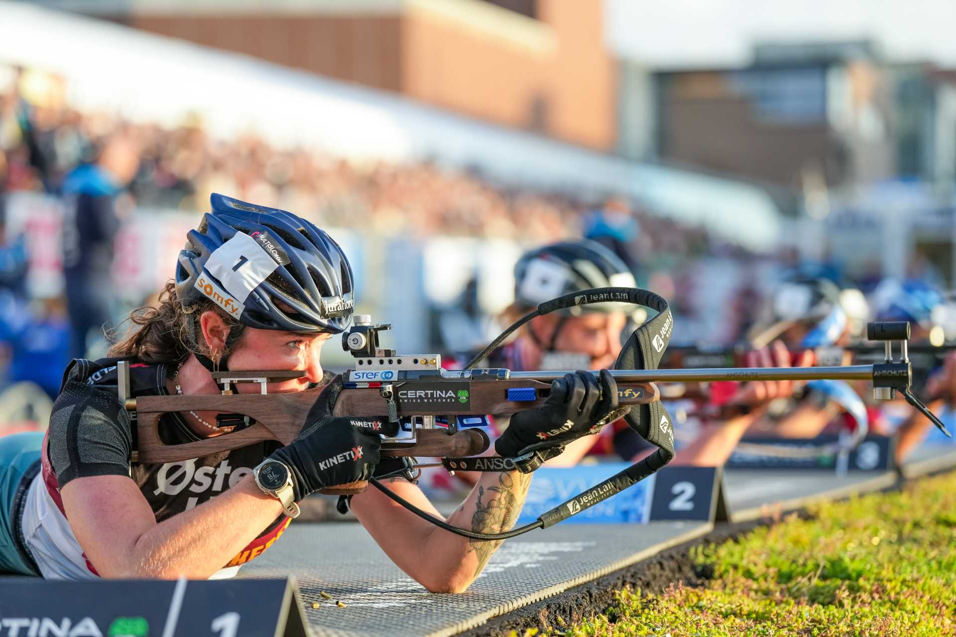 The finals up the ante for the 15 qualifiers in both the women’s and men’s competitions. The distances go up from the three 1.8 km loops in the heats to five loops, featuring four shooting bouts, no spare rounds and the 60-meter penalty loop for each missed shot. The shooting order is prone, prone, standing, and a final decisive standing stage before the dash to the finish.