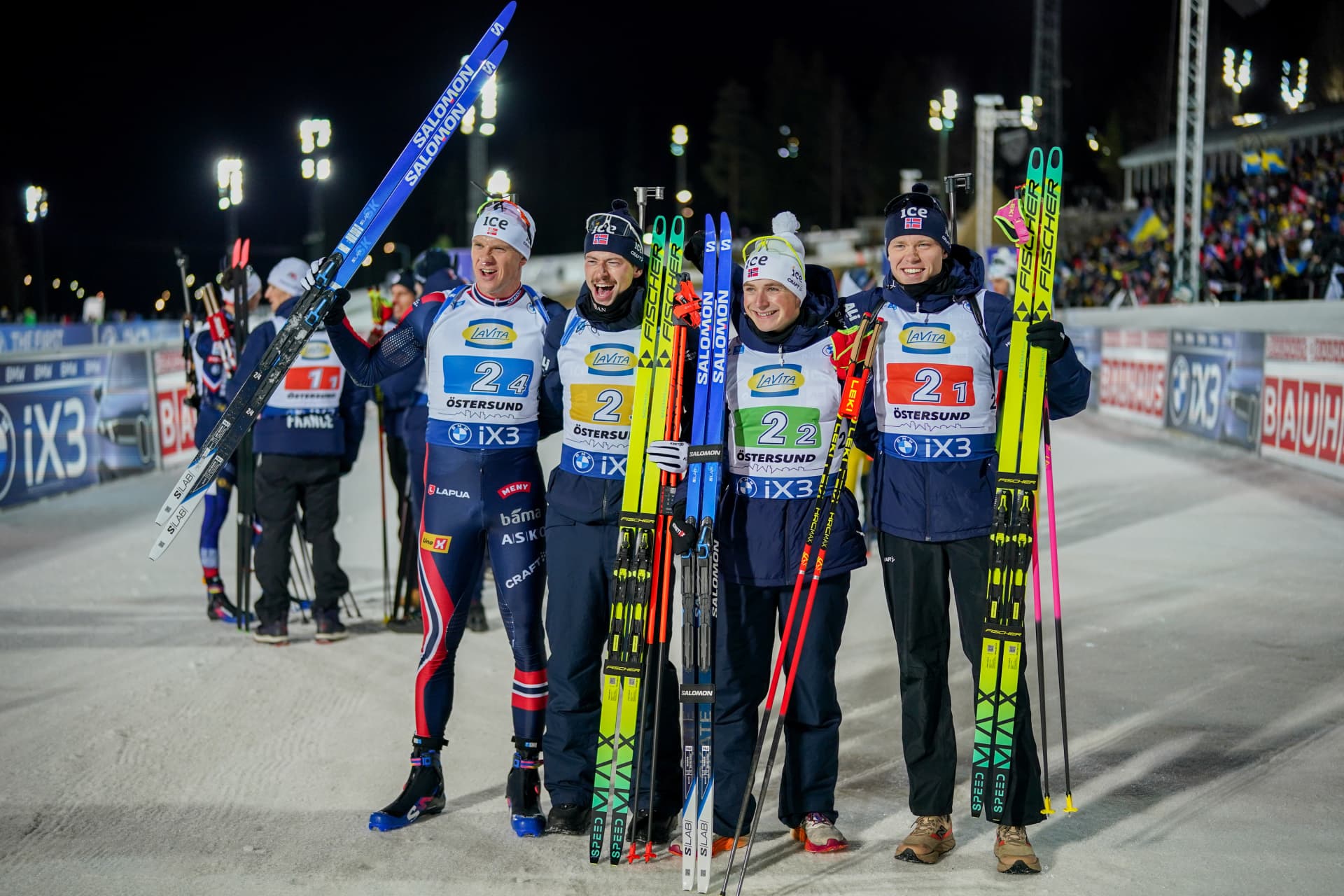 Vetle Sjaastad Christiansen’s prone penalty did little to dent Norway’s rout in the Oestersund Men’s 4 X 7.5 km Relay this afternoon when he cleaned standing, flying to a 1:11:10.1 victory. Christiansen and teammates Isak Leknes Frey, Martin Uldal and Sturla Holm Laegreid, with a penalty and ten spares led after the first leg standing stage and went unchallenged from that point.