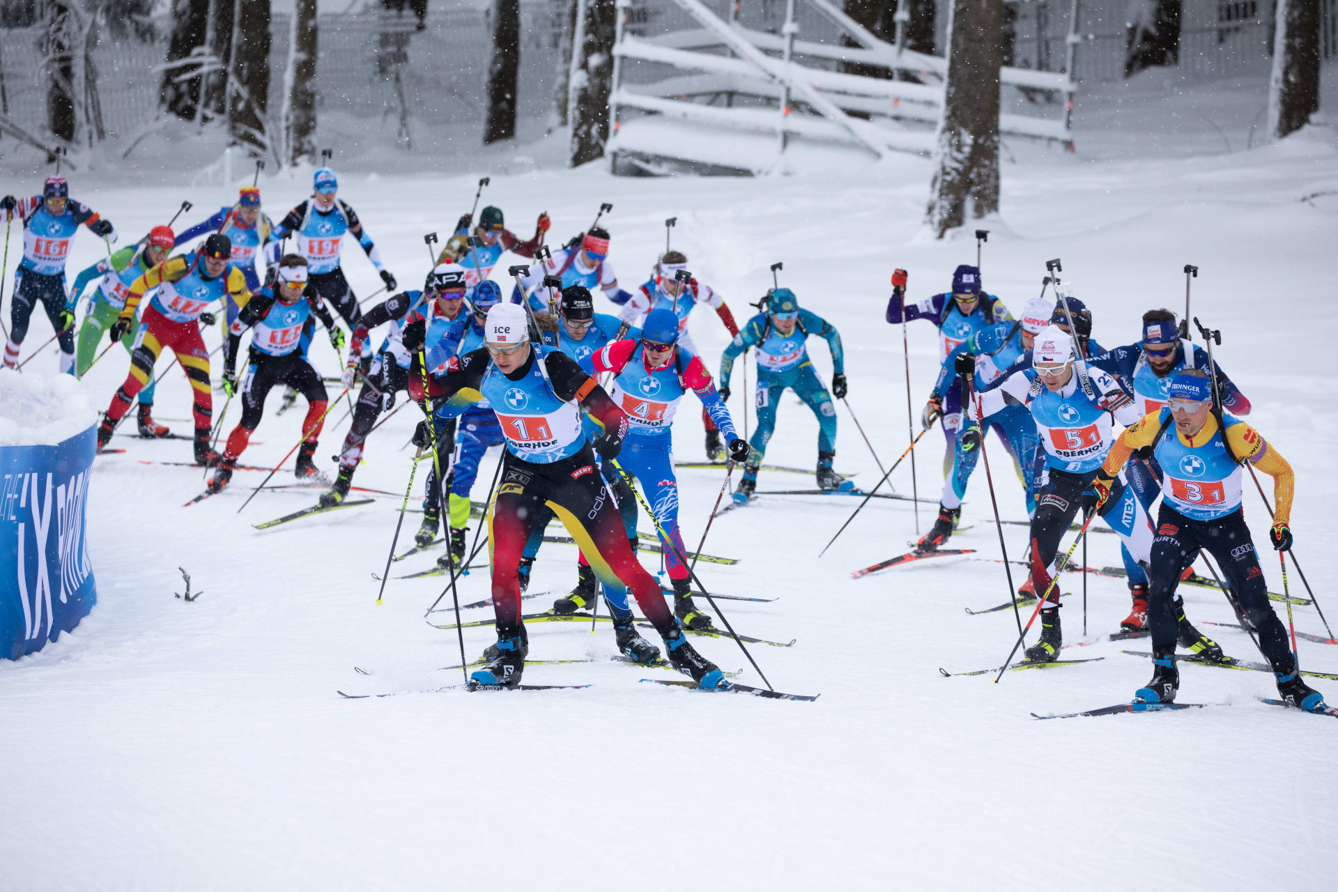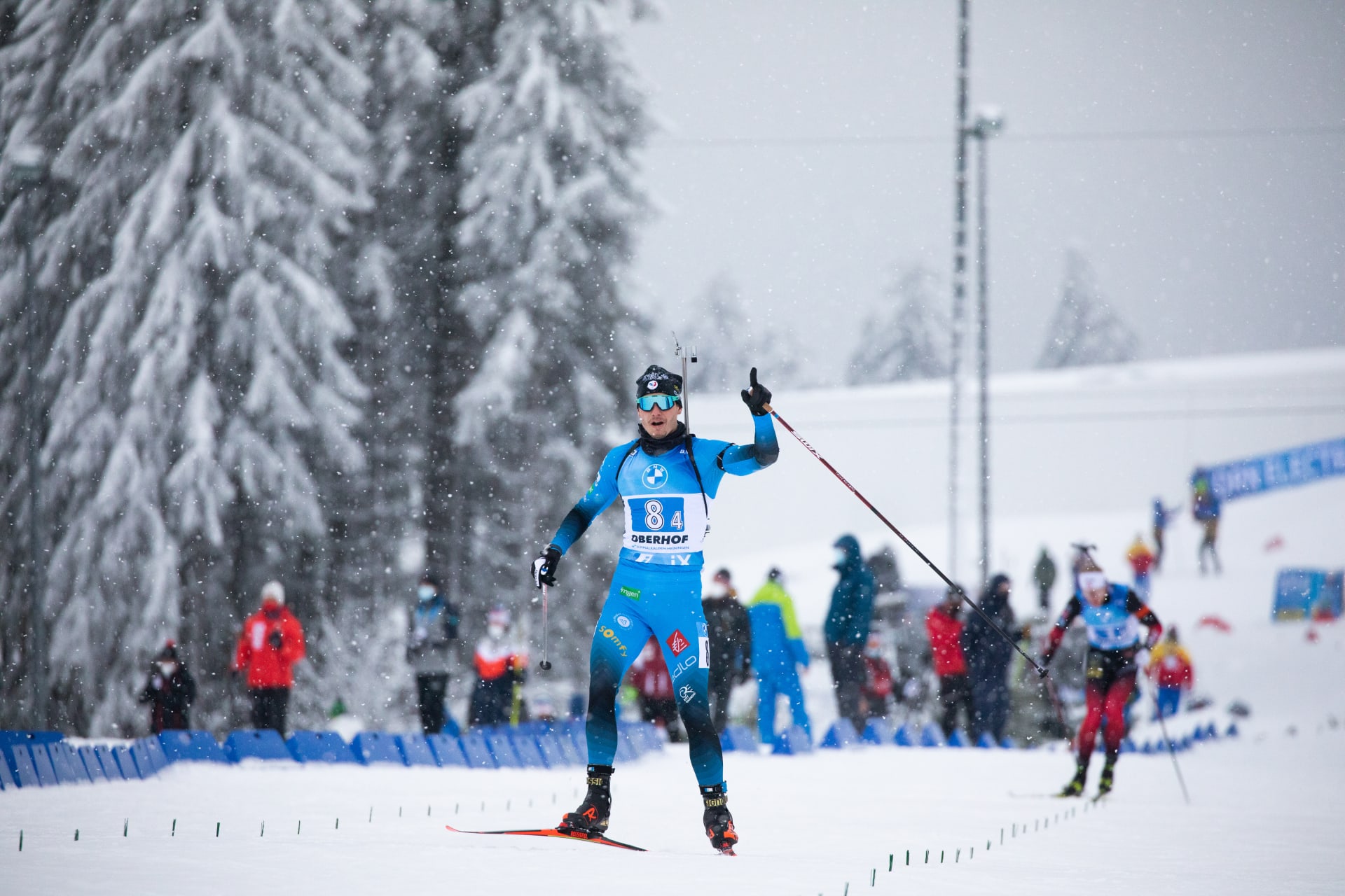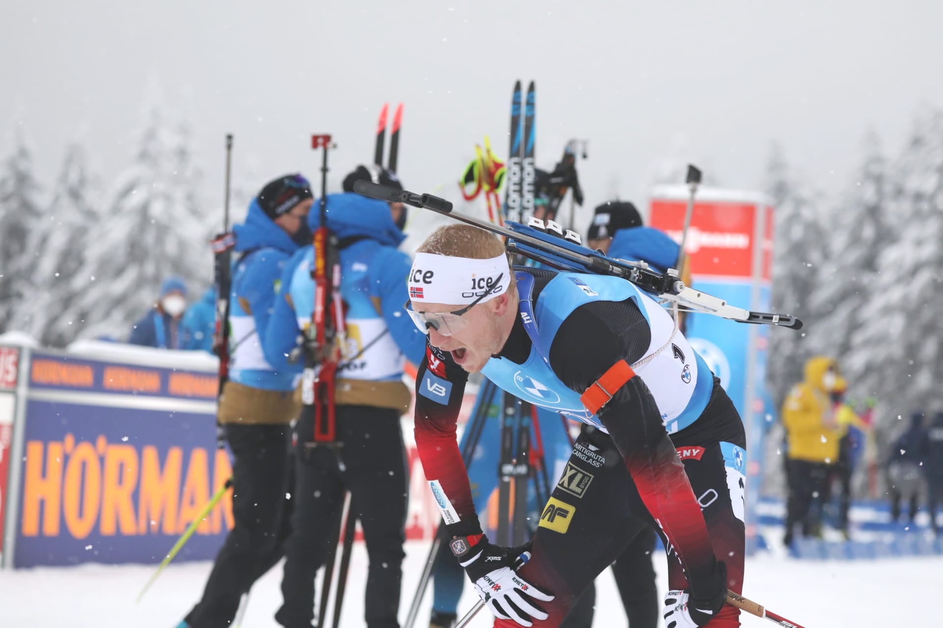 In prone, Horn imploded, missing his first five shots before ending up with five penalty loop tours, Jacquelin cleaned in six shots to take the lead. Windisch cleaned in five to go out 21.7 seconds back. Johannes after a strong first loop, also cleaned in five to close the gap down to 35 seconds. The Norwegian star skied extremely aggressively, moving up to Windisch. Jacquelin blasted through five shots, missing one, reloaded, sent the target to white and was gone. Johannes shot like he skied, went 5-for-5 but remained 23 seconds back. Windisch after two spares left securely in third position,44.7 seconds back.