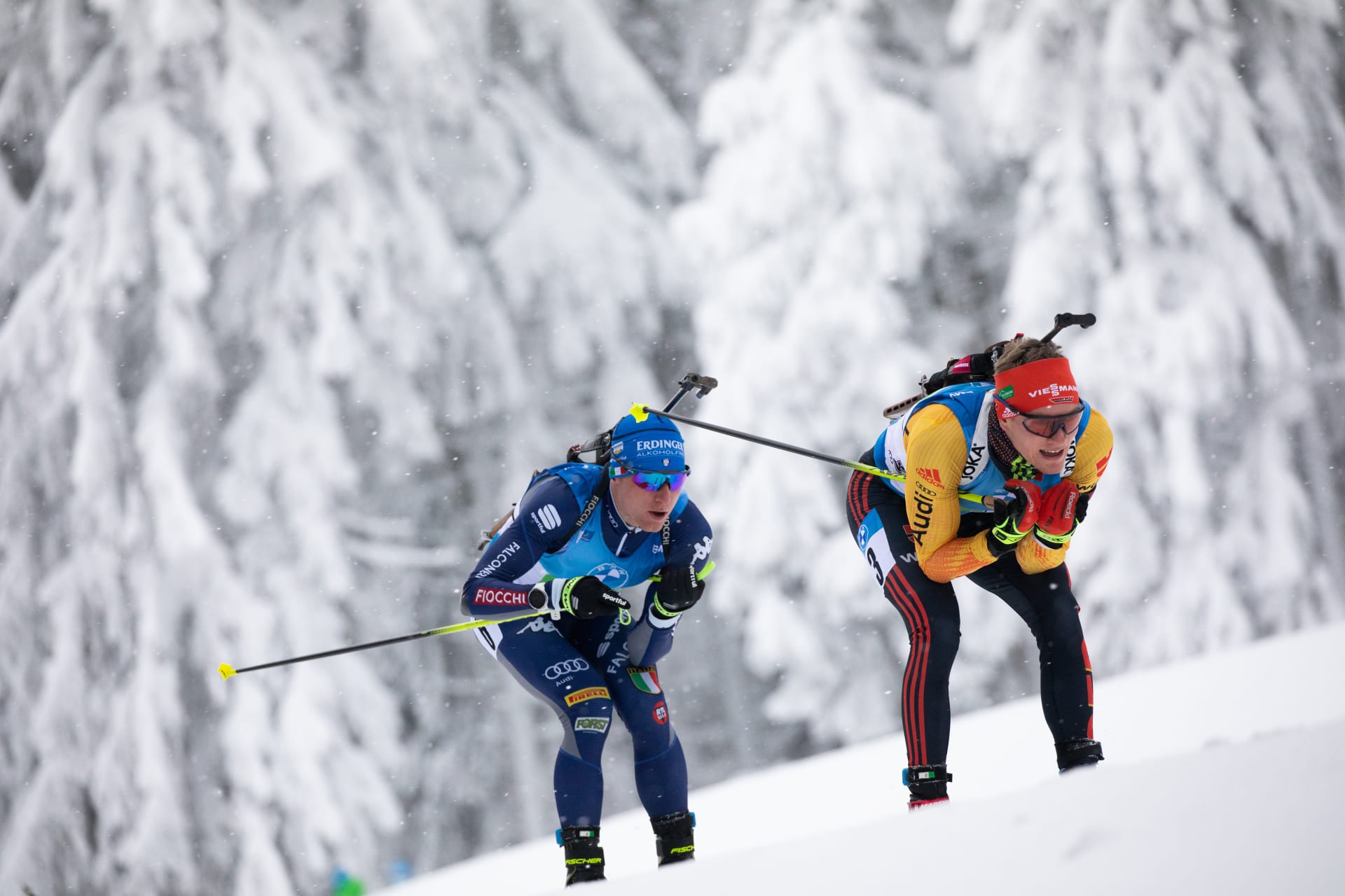 Light snow on a windless afternoon greeted the 24 teams that started the men’s relay. Norwegian leadoff leg Vetle Sjaastad Christiansen led the pack into the first prone, dispatched his five targets and left second just behind Belarus, with nine teams following within 10 seconds. Italy’s Thomas Bormolini needed a spare to clean but left the range a step ahead of Erik Lesser who went 5-for-5 after using two spares in prone, with only Belarusian Mikita Labastau perfect on the range in the first leg. At the first exchange, Lesser tagged Benedikt Doll just .7 seconds ahead of Italy’s Lukas Hofer, followed by Fillon Maillet, Switzerland’s Jeremy Finello and Johannes Dale taking over for Norway 6 seconds back.