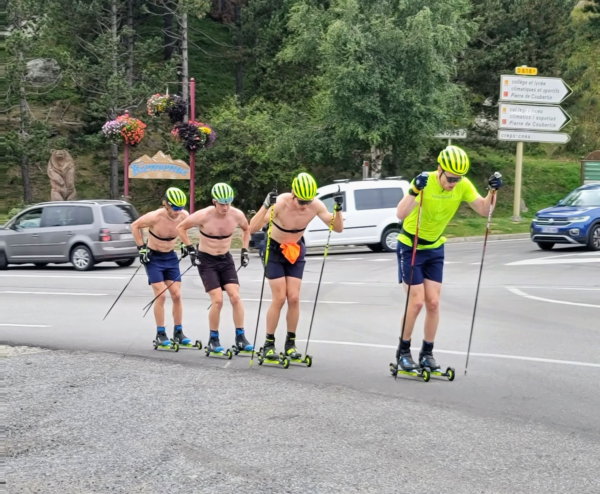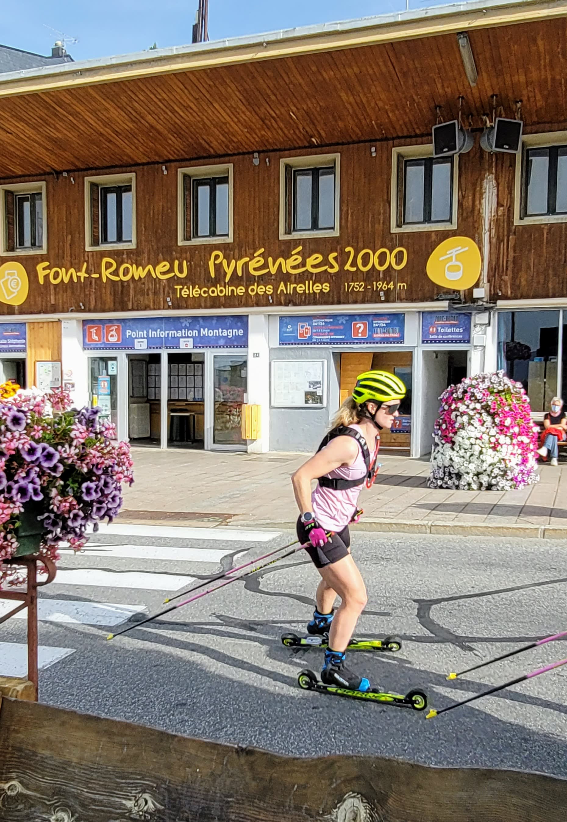 Afternoon came after as usual in the world of train, eat, sleep (rest) and repeat. With the thought of a rest day in 12 hours, another rollerski session was on the menu. On another lightly-travelled mountain road, the women were on the road first with the men jumping out a couple of kilometers farther down the grade near the Spanish border. Menu details: six-minutes of seriously uphill double-poling, a few minutes recovery and repeat, on a 26C afternoon. Sweat and labored breathing ensued. With each double-pole hard section, the two groups crept up higher up the mountain road, clacking through Font Romeu as tourists stared; the last 4 km of the climb dug into energy reserves. Finishing just below the ski lifts at the 2003-meter Col del Pam, the women had covered 10 km of uphill, the men 12 km, both with over 400 meters of altitude gain. Ski boots and roller skis were quickly exchanged for running shoes; 45 more minutes of running and bounding with poles on rocky trails; another training day was in the books.