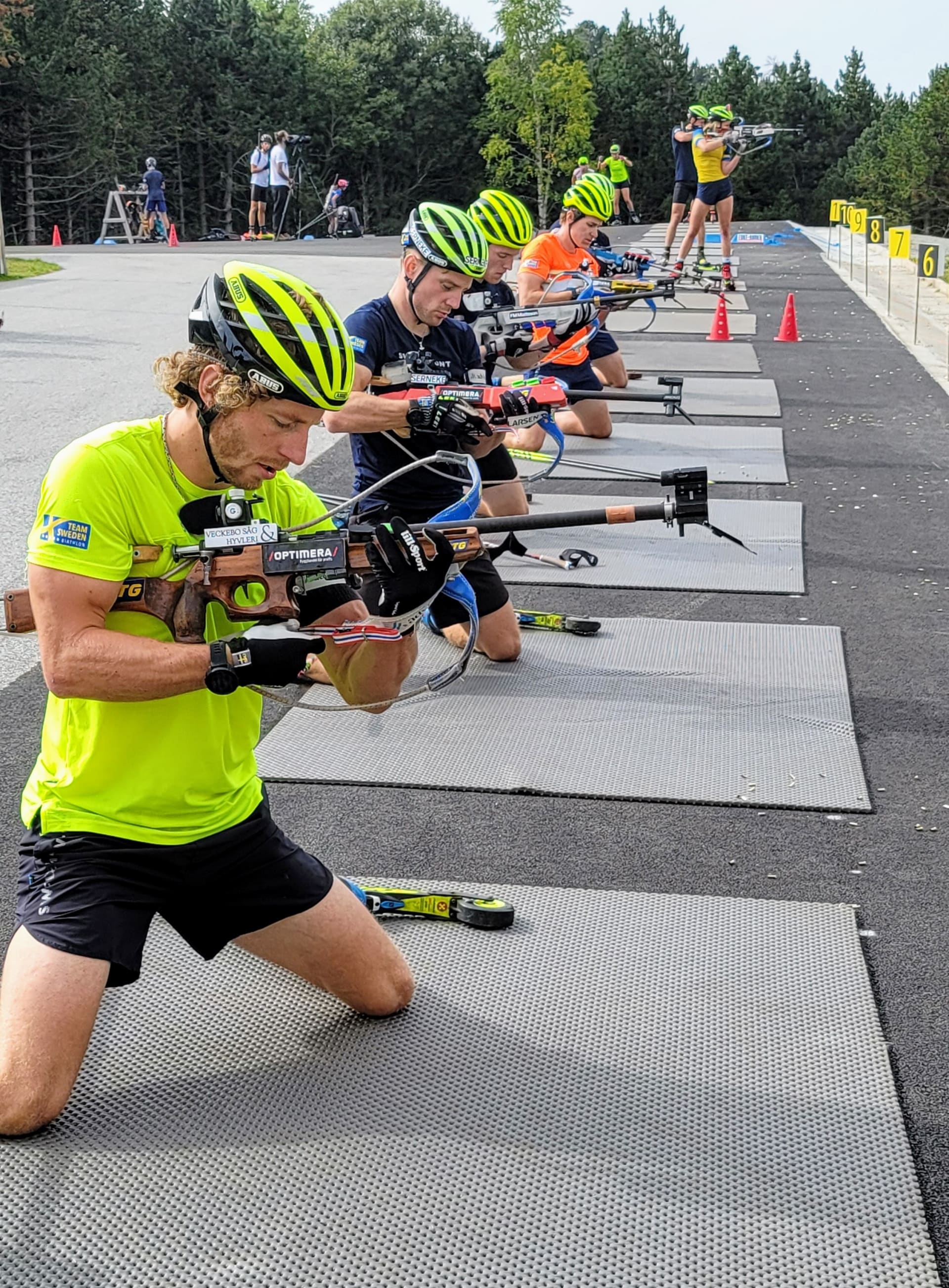 Rifles and energy bars appeared simultaneously at the range: five shots on paper, a bite, look through the scope and five more shots, another bite, target check and five confirmation shots. Zeroing completed. A few words from shooting guru Jean Marc Chabloz were followed by a big mass start competition: 80-meter “loops” at the range four fast shooting bouts and a “penalty” loop the size of a large bedroom. The shooting was fast and furious, with not many penalties, Someone came out on top, but it was irrelevant; it was simply some fun disguised as work. After a quick drink and reloading, the roller track beckoned, adding more volume before another four-stage battle, first the men, followed by the women a few minutes later. Samuelsson topped his teammates with a furious last loop sprint. Some more time on the roller skis, a few more bouts with several one-on-one tidbits of advice from Chabloz. Peppe Femling came to the range for the last five shots of the day with all eyes on him: four closed quickly, the last one didn’t; his shoulders slumped. Lukas smiled, patted him on the back…another three plus hours in the training diary, time for a well-deserved lunch.